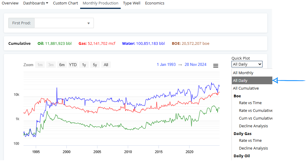 Monthly volumes are the most common way to view production in WellDatabase, but you can easily switch to calculated daily volumes as well.