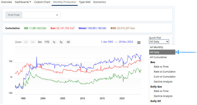 Monthly volumes are the most common way to view production in WellDatabase, but you can easily switch to calculated daily volumes.