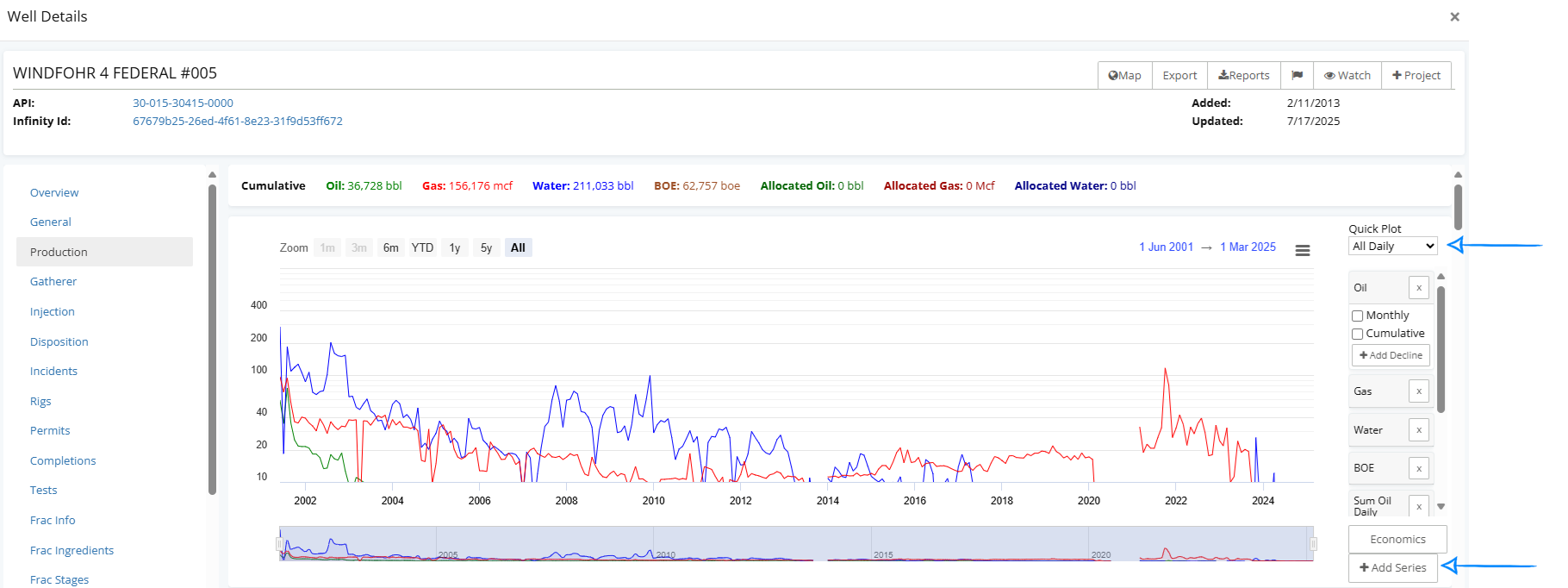 To add the daily volumes for a single well in the well details card ->production tab, the same process can be applied to switch the quick plot or add a series.