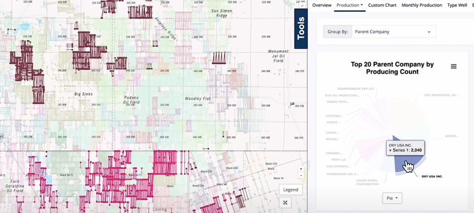 Or in contrast, if you color your well spots by Current Operator - Aliased and group your analytics by parent company. Hovering over one of the pie chart pieces will highlight these wells on the map, and if you left click - you can filter to these wells.