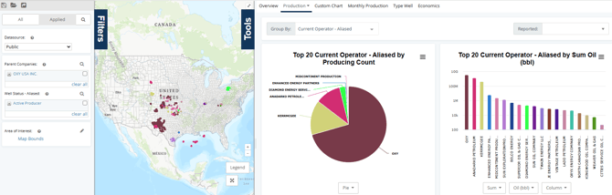 Alternatively, you can color your well spots by Current Operator – Aliased and group your analytics by Parent Company. Hovering over a slice of the pie chart will highlight the corresponding wells on the map, and clicking a slice will filter the view to only those wells.